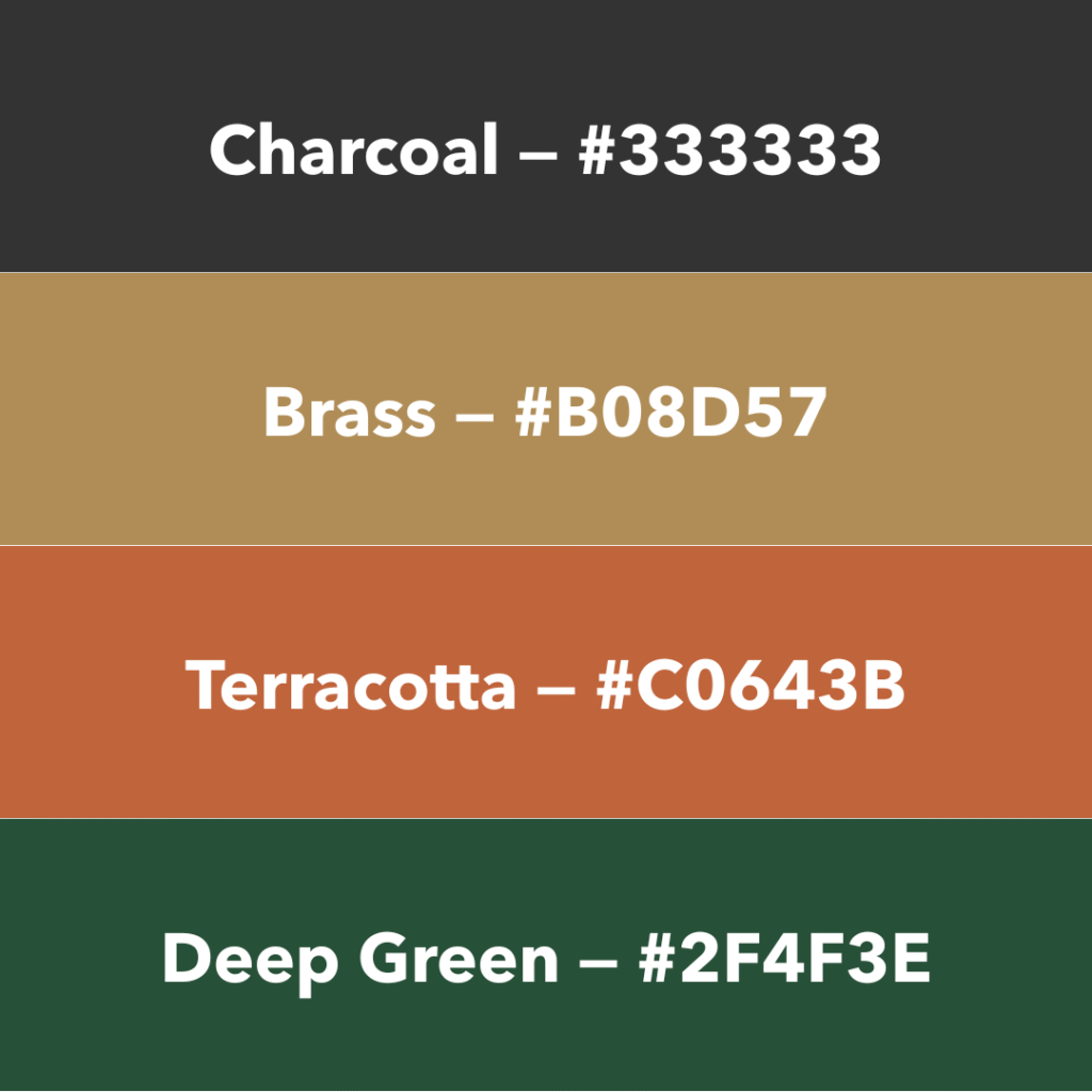 Soft whites, warm taupes, beiges, and muted greys make great base colors. Charcoal, terracotta, and matte black can add richness.